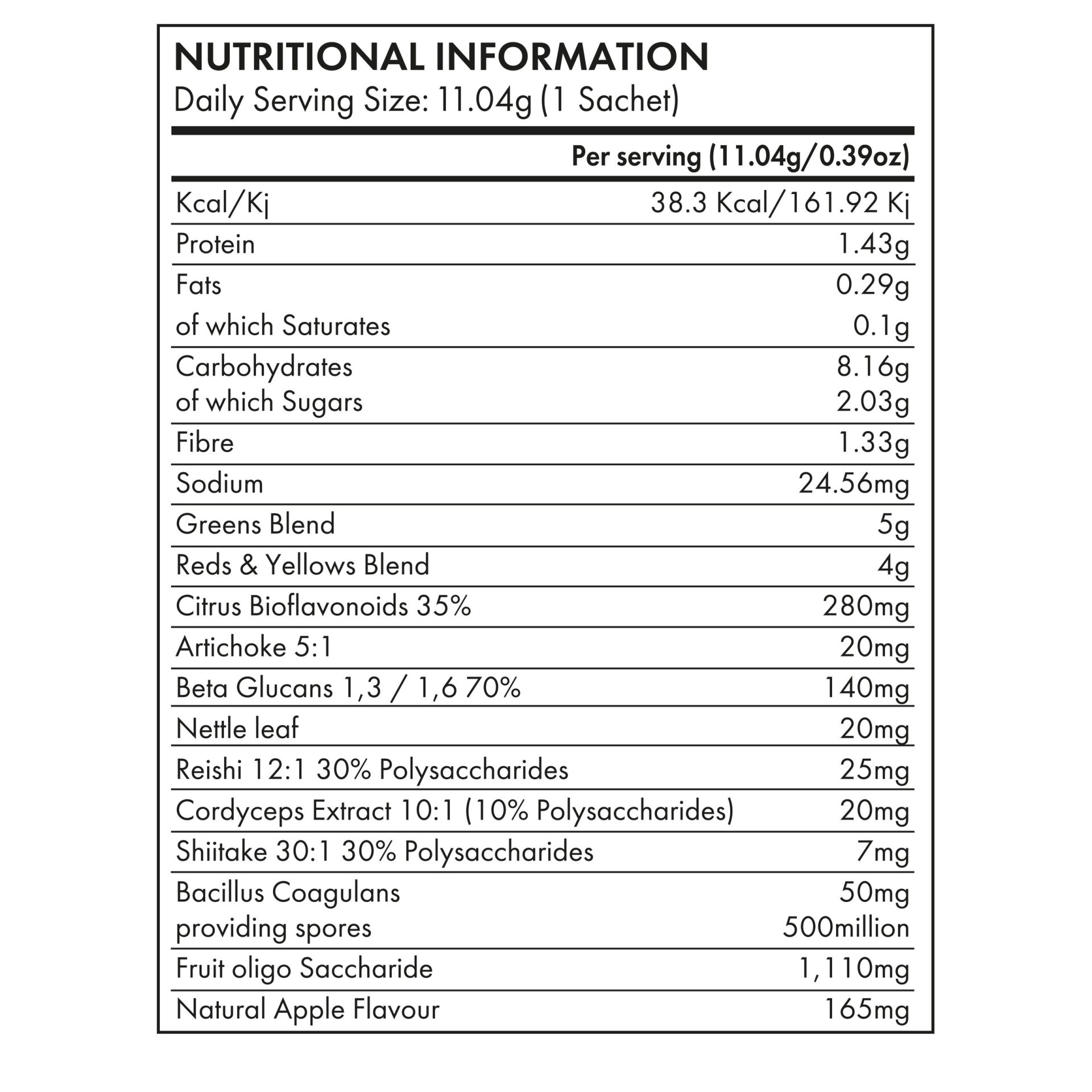 A ready-to-mix powder blend of plant, vegetable and fruit extracts, with friendly gut bacteria and fibre. Natural flavouring of apple.