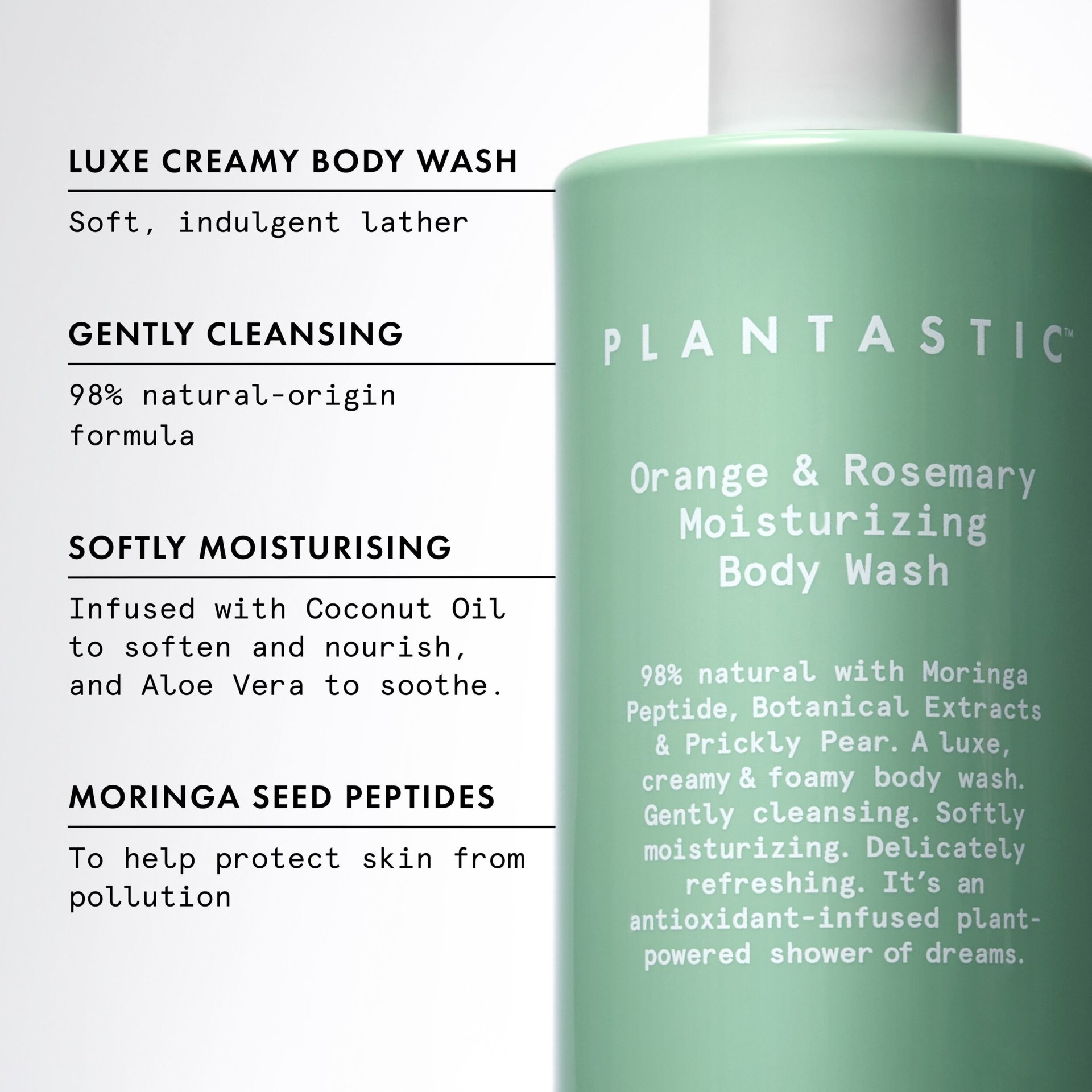 + 98% natural with Moringa Peptides, Botanical Extracts & Prickly Pear. + A luxe, creamy & foamy body wash. + Gently cleansing. Softly moisturising. Delicately refreshing. + It’s an antioxidant-infused plant-powered shower of dreams.