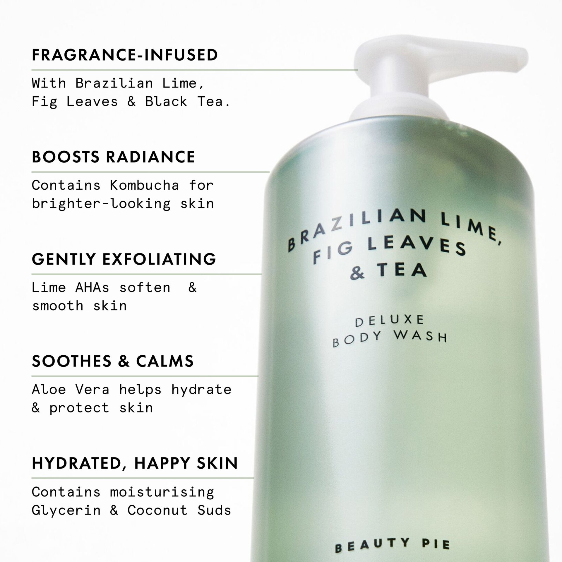 + Fragranced With Brazilian Lime, Fig Leaves & Tea. + KOMBUCHA (from the fermentation of sweet Black Tea) - Known for its smoothing and radiance-boosting properties. + LIME ALPHA HYDROXY ACIDS - Extracted from limes, with a gentle exfoliating action for softer, smoother and brighter looking skin. + ALOE BARBADENSIS LEAF JUICE - To hydrate and protect skin. + Plus GLYCERIN and COCONUT SUDS. + SLS/SLES-free. + Vegan.