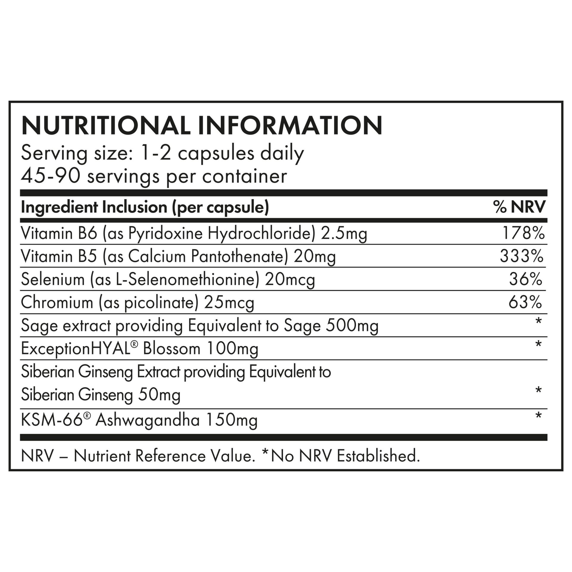 + ExceptionHYAL® Blossom - Scientifically developed to support the menopause with Hyaluronic Acid. + Sage - Supports menopause and historically used to support hot flushes. + Siberian Ginseng - An adaptogen for balancing and energising. + KM66 Ashwagandha - Supports mental and physical wellbeing. + Vitamin B6 - Contributes to the regulation of hormonal activity, normal psychological function and energy-yielding metabolism. + Vitamin B5 - Contributes to normal mental performance. + Chromium - Contributes to the maintenance of normal blood glucose. + Selenium - Contributes to normal thyroid function and normal hair and nails.