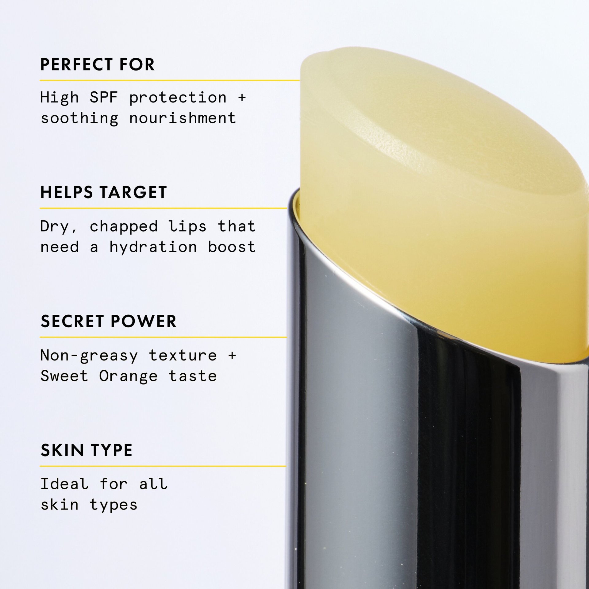 + With a lightweight, balmy texture and uplifting Sweet Orange scent. + Contains SPF 30 for UVA/UVB protection. + Infused with Squalane for softer-looking lips, Avocado Oil to deeply condition and soothe, and Vitamin C to reduce the look of fine lines.