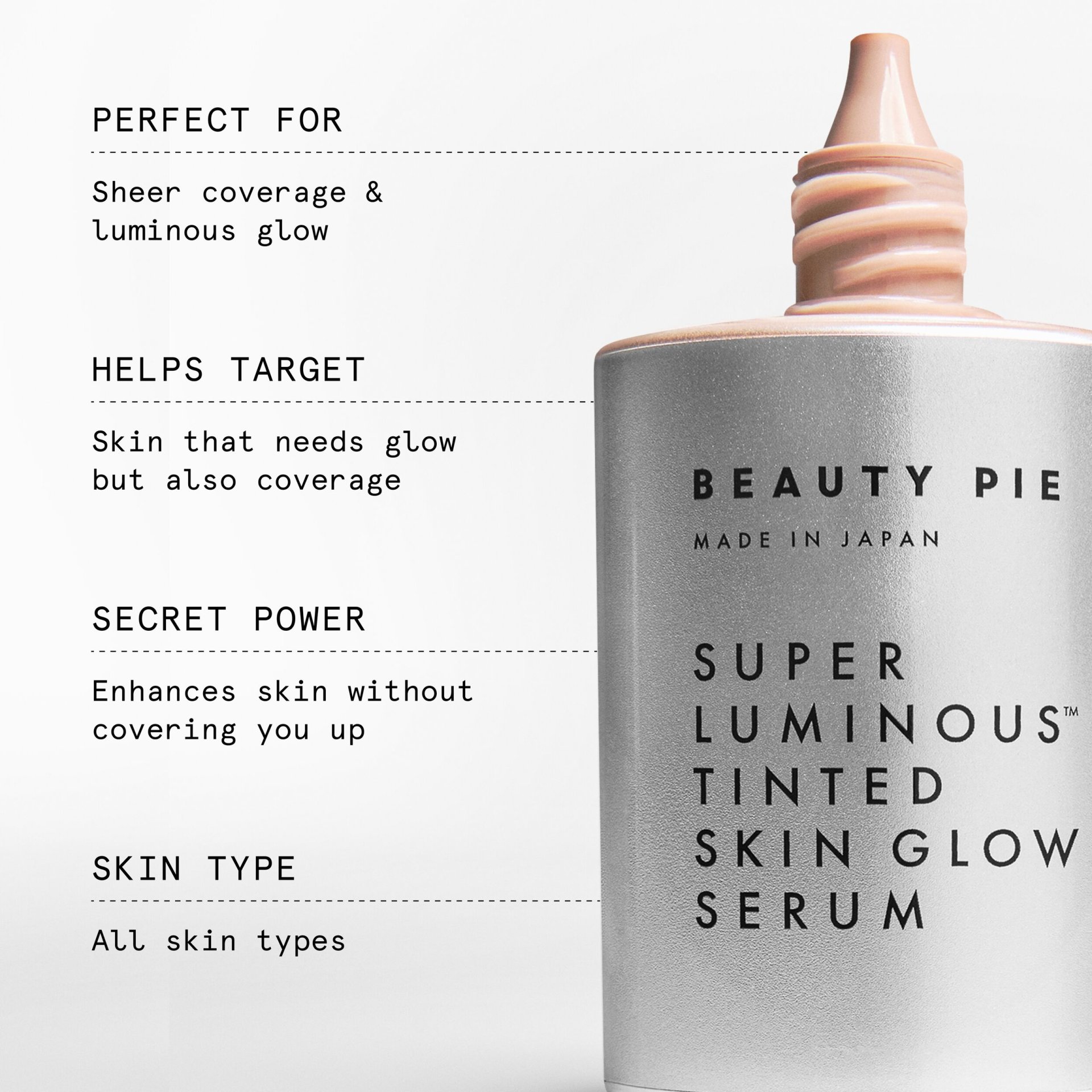 Perfect For: Sheer, light coverage with additional luminosity Helps Target: Skin that needs a little extra polish Secret Power: Luminous coverage with light-reflecting skincare technology built-in Skin Type: All skin types