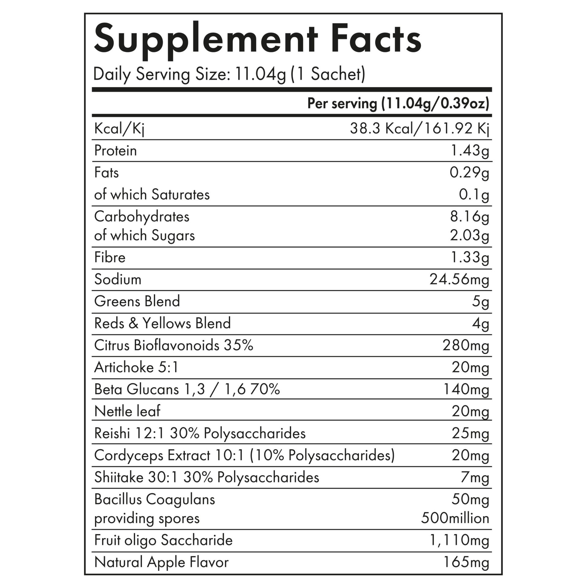+ Bacillus Coagulans (with 500 million CFUs) and Fructo-Oligosaccharides (fibre), thought to aid digestion.