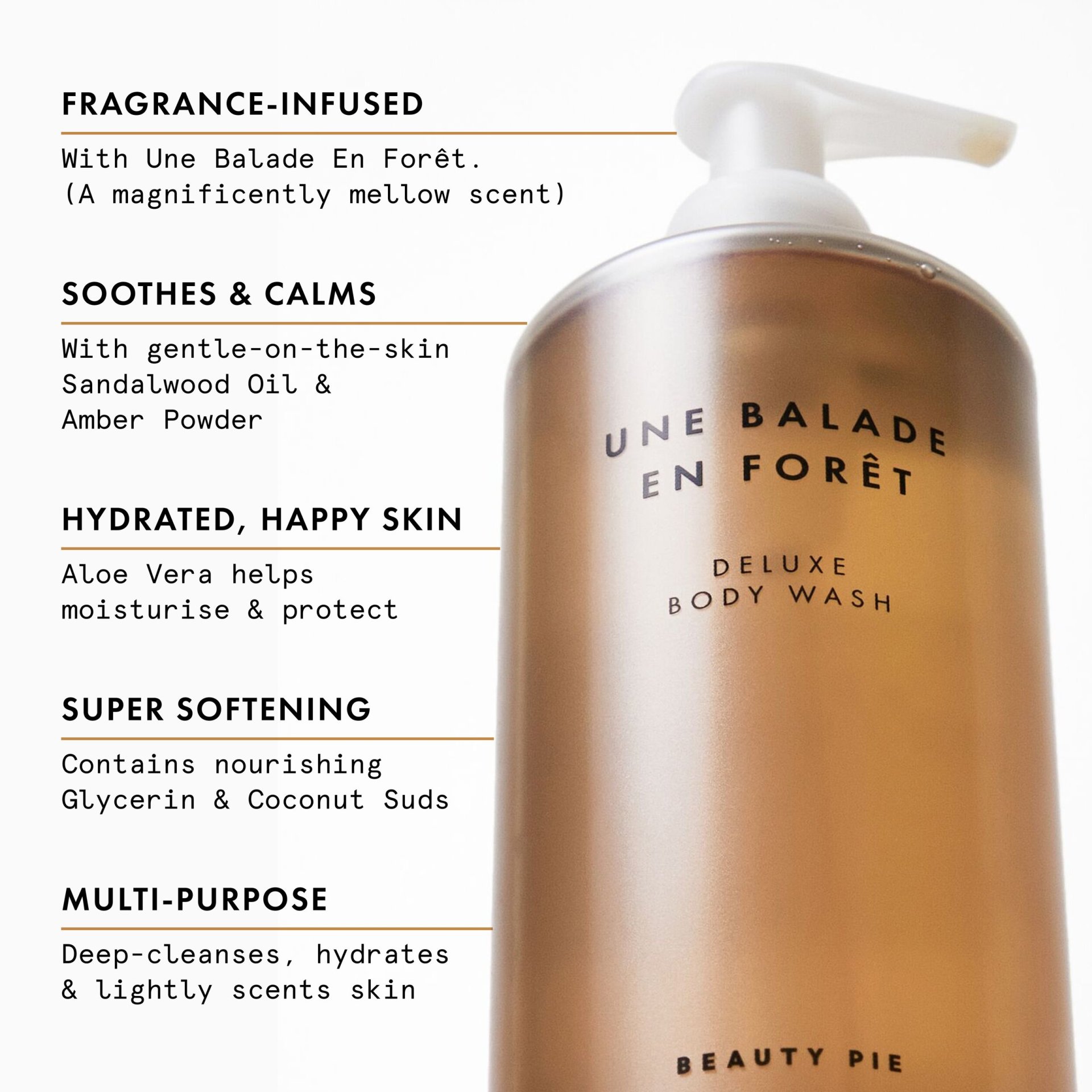 + SANDALWOOD OIL & AMBER POWDER - For soothing and calming. + ALOE BARBADENSIS LEAF JUICE - To hydrate and protect skin. + Plus GLYCERIN & COCONUT SUDS. + SLS/SLES-free. + Vegan.