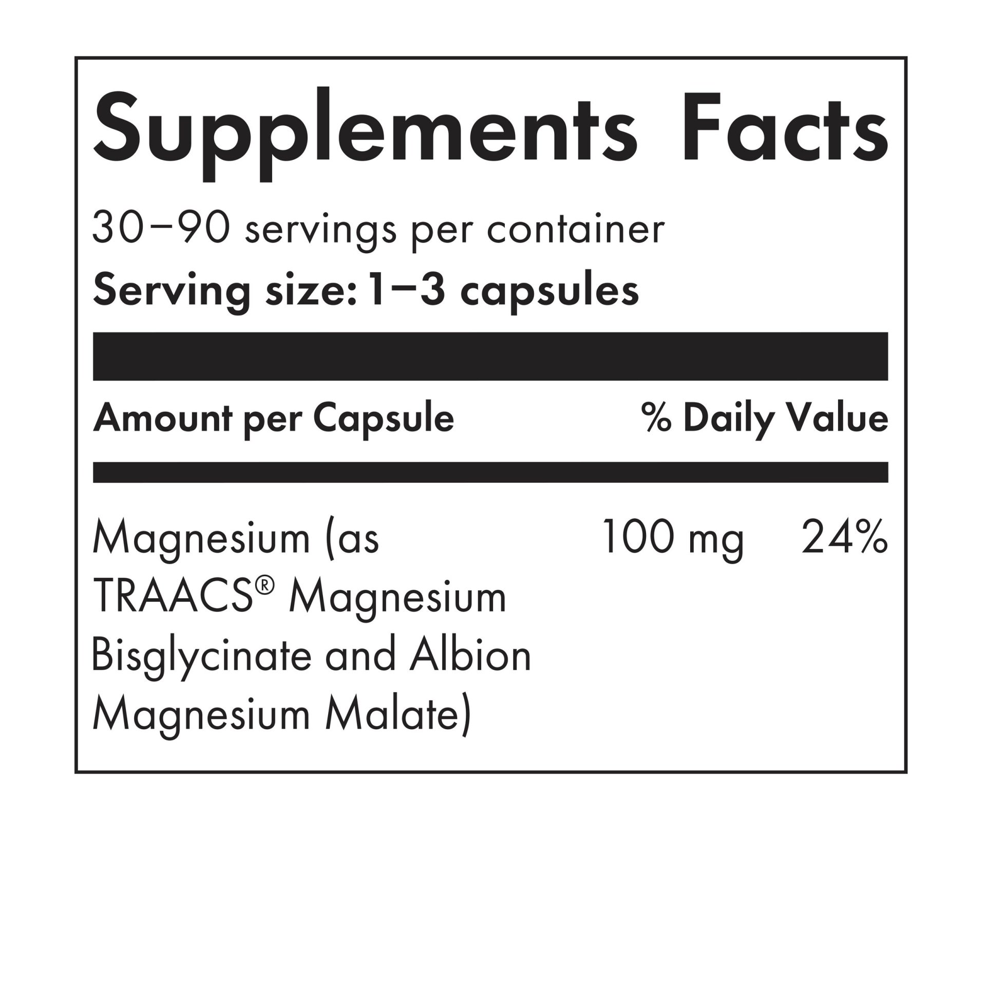 Professional practitioner-grade dual-source Magnesium with TRAACS™ Magnesium Bisglycinate and Albion™ Di-Magnesium Malate. + Delivers 100mg elemental Magnesium per capsule.
