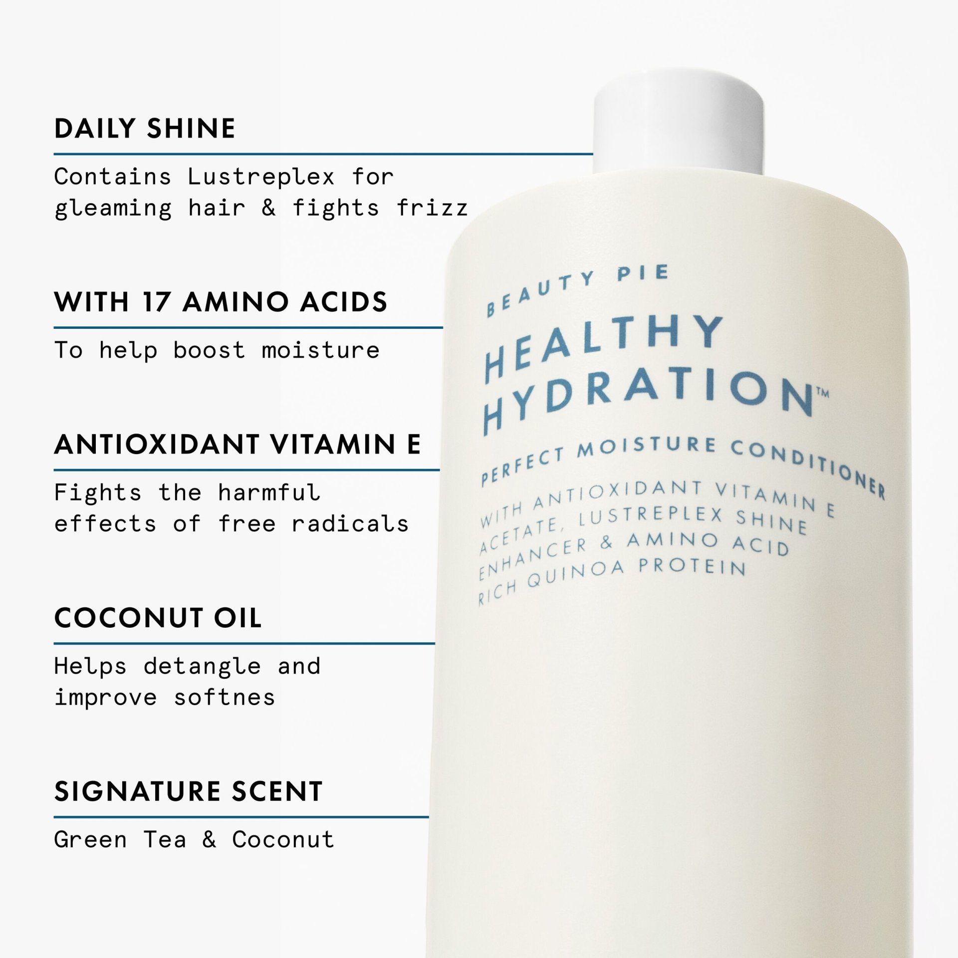 + LUSTREPLEX SHINE-ENHANCER - For frizz-resistance, plus amazing daily shine with no build-up. + QUINOA PRO NPNF™ - Composed of 17 Amino Acids that are known to help boost hair moisture. + COCONUT OIL - Helps detangle and improve softness. + VITAMIN E ACETATE - An antioxidant that fights the harmful effects of free radicals. + With our signature Tea & Coco haircare scent. (Zingy citrus, comforting coconut and refreshing green tea.)