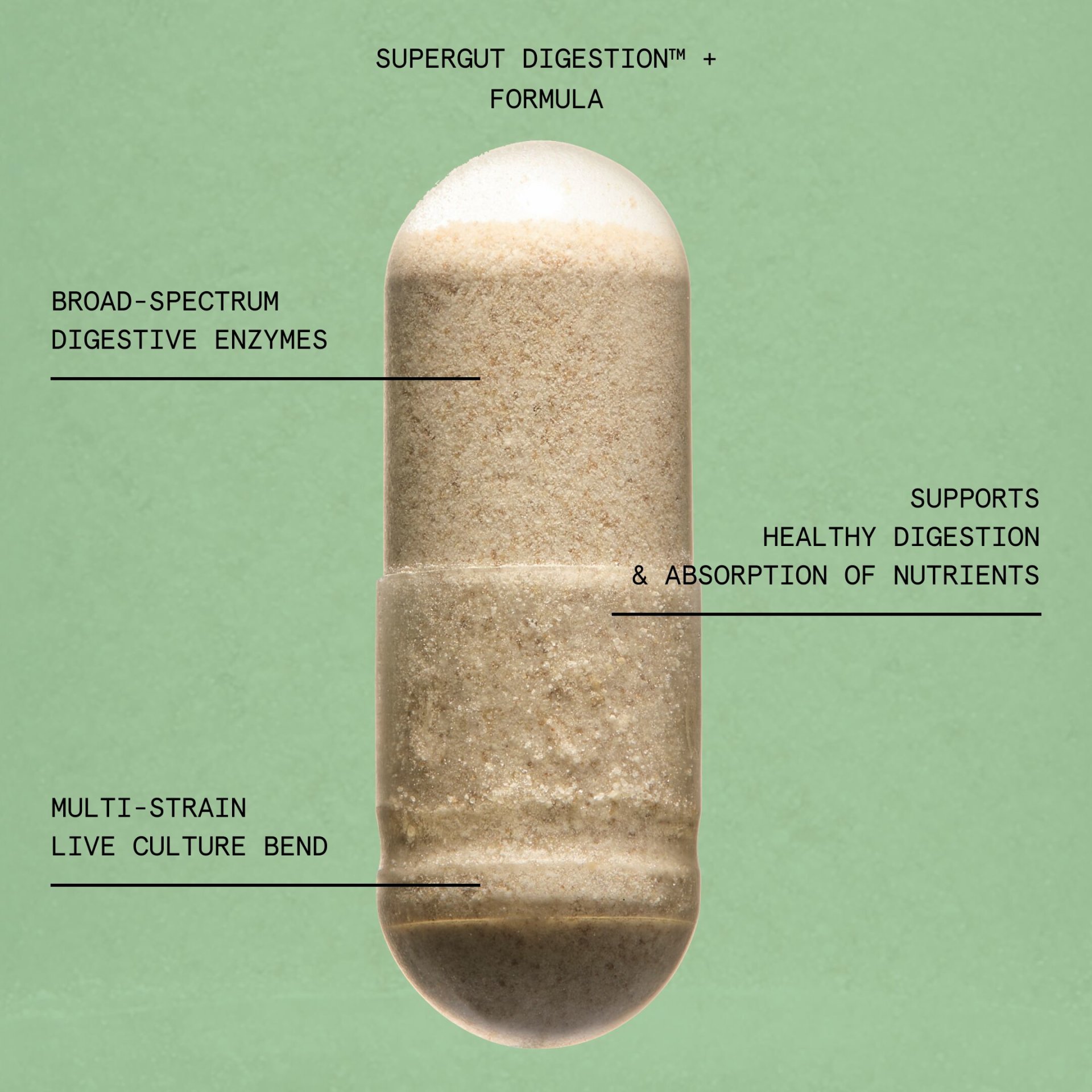 SuperGut Digestion+ Formula is a multi-strain, live-culture blend containing a broad-spectrum of digestive enzymes to help support healthy digestion, including: