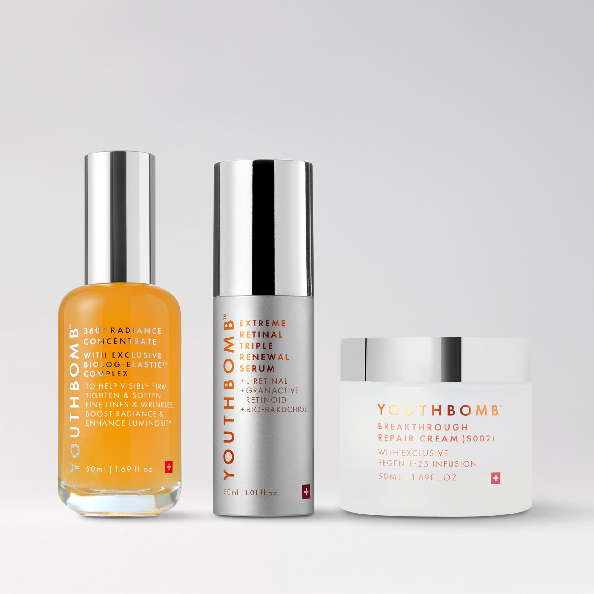 Gently sweep 2-3 pumps of the Youthbomb 360° Radiance Concentrate over your clean face and neck. Apply the Youthbomb Breakthrough Repair Cream on top. (You can re-apply both at night if you’d like to). Follow with SPF as your final skincare step.